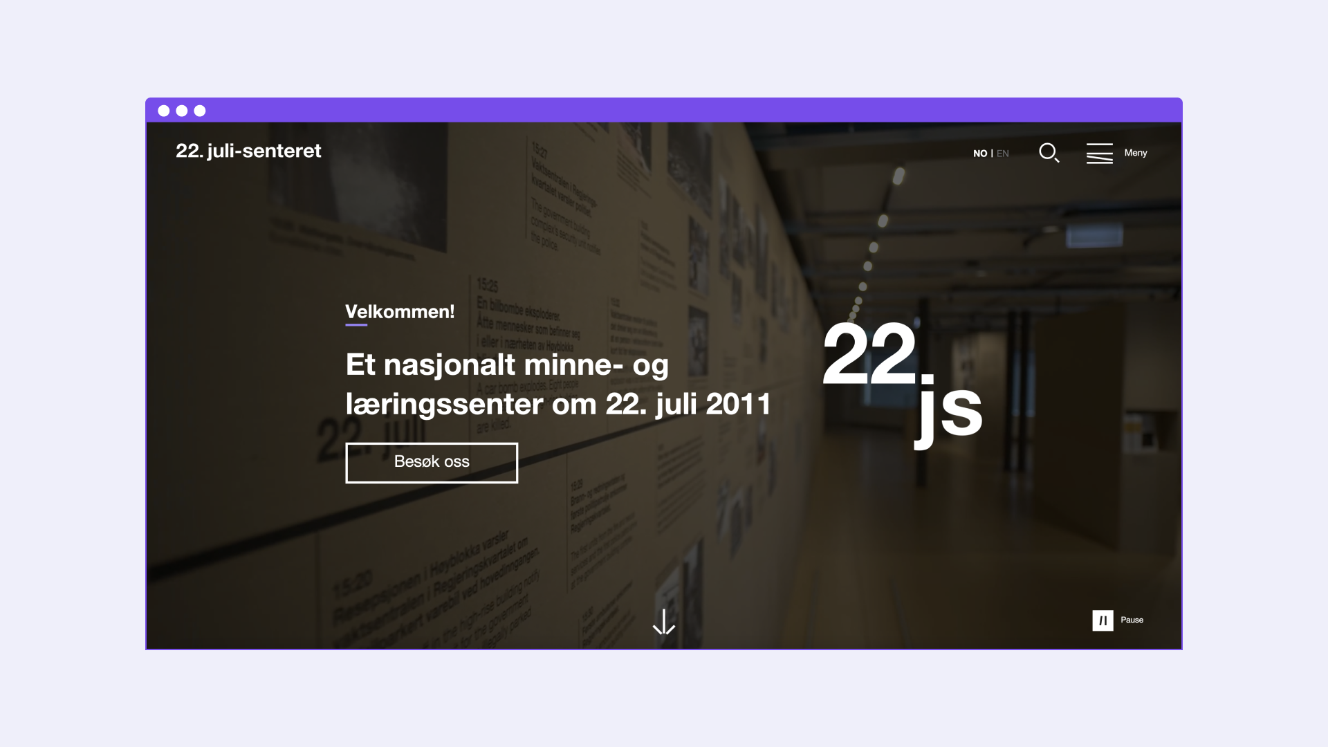 22. juli-senteret hadde behov for utarbeidelse og implementering av nytt nettsted, basert på en ny publiseringsløsning. En ny bookingløsning og justering av visuell profil var også høyt prioritert. Målet var å skape et oversiktlig, innbydende, innholdsrikt og formidlende nettsted, som er fleksibelt og skalerbart.
