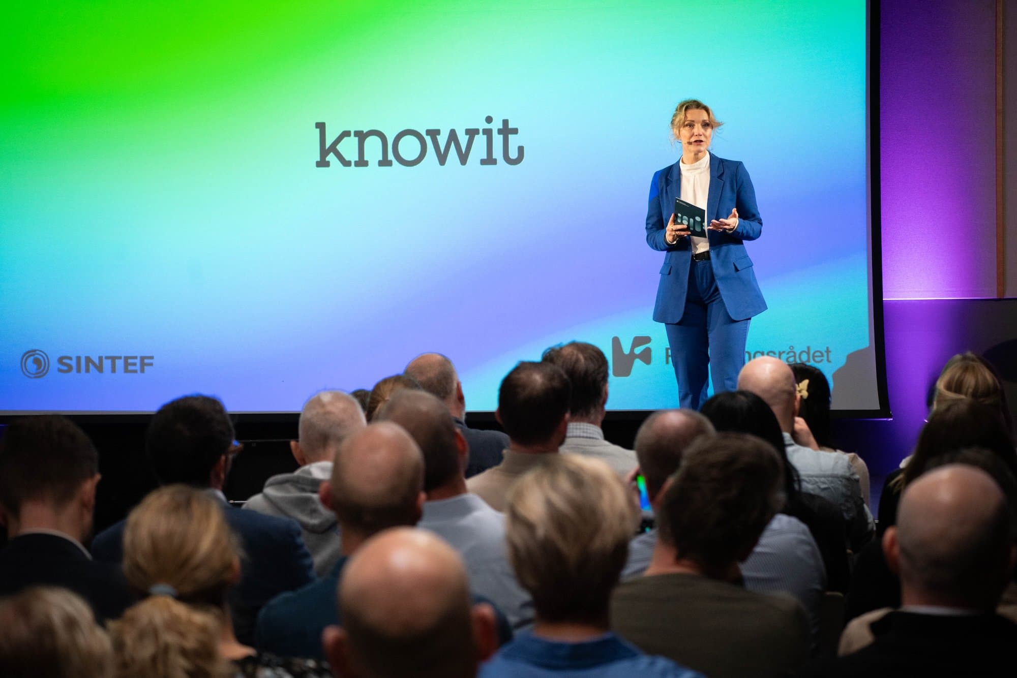 Mandag 3. november var rundt 180 ledere, forskere og fagpersoner samlet på Rebel i Oslo da Knowit og SINTEF inviterte til temadagen «Fra hype til hverdag: Hvordan KI påvirker produktutvikling, teamarbeid og organisasjoner». Dagen var et samarbeid støttet av Norges forskningsråd, og hadde som mål å vise hvordan kunstig intelligens faktisk kan gi verdi – ikke bare i teorien, men i hverdagen.